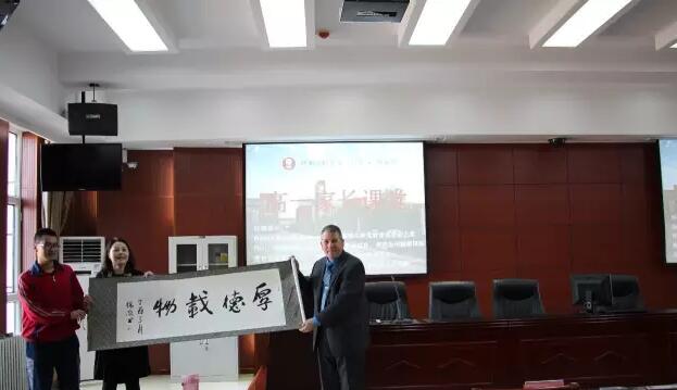 国际部高二年级学生杨澈将自己写的软笔书法作品“厚德载物“赠送给Mr. Robert,表达自己想要将中国优秀的传统文化传承并发扬的理想与志向。